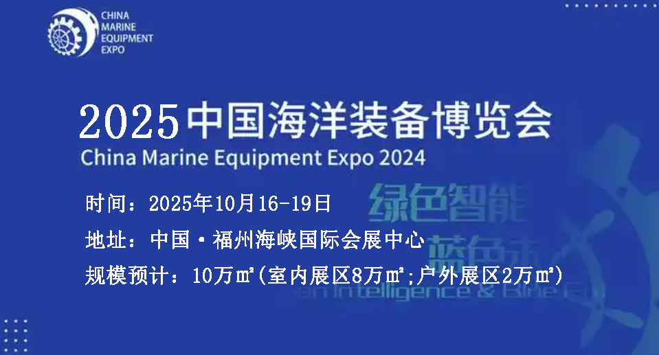 2025中国海洋装备博览会|2025世界航海装备大会|2025国际海事展览会 2025中国海洋装备博览会|国际海事展会|船舶装备展览会|航运物流及装备展 发起创办:福建省人民政府 中国船舶集团有限公司 主办单位:中国海洋装备博览会组委会 承办单位:中船蓝荟(福建)海洋装备会展有限公司 组委会参展:刘经理 138 2646 0801 同V 欢迎参观/参展! 展会时间:2025年10月16-19日 展会地址:中国·福州海峡国际会展中心 展会规模预计:10万㎡(室内展区8万㎡;户外展区2万㎡),10万+观众,100+国家,700+参展商